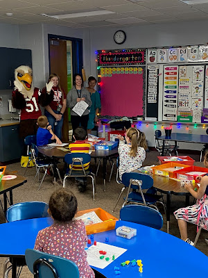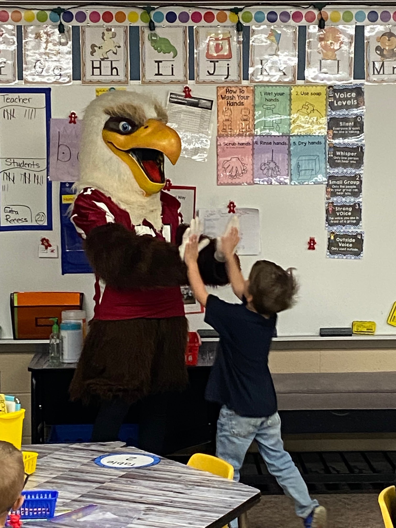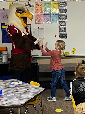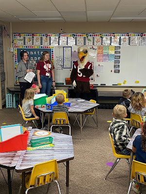 Elmo Eagle from Chadron State College made a visit to Chadron Primary School last Friday and the students were thrilled! Elmo was here to promote his coloring contest for the Chadron State Homecoming. Students were presenting with a coloring sheet and the details and it was explained that the winning students' pictures that are chosen by a committee will have the chance to ride on the Homecoming Parade float with Elmo; only students in grades K-4 are eligible for the coloring contest. We are excited to partner with Chadron State College ~ Roll Birds!!